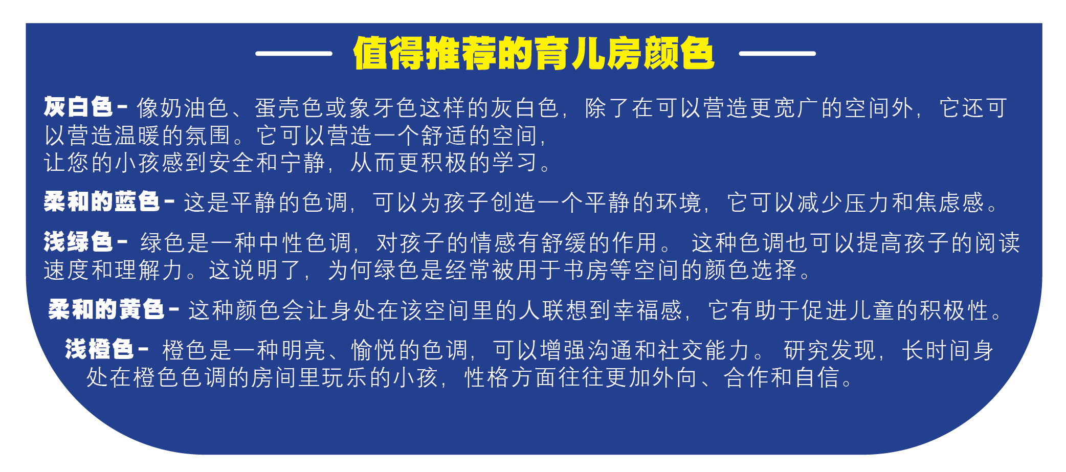 小孩的睡房应避免使用太明亮或大胆的颜色,如霓虹绿、亮橙色或粉红色。这些太耀眼的颜色可能会刺激孩子的视觉而无法轻松的入睡。此外,鲜艳的颜色也会分散小孩的注意力,使他们难以专注于课业或阅读。