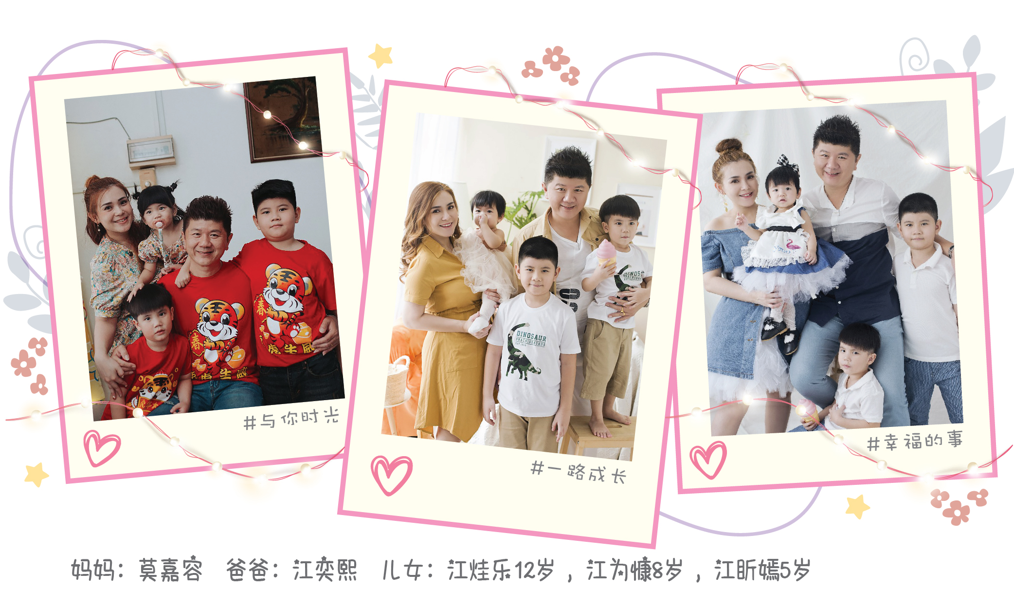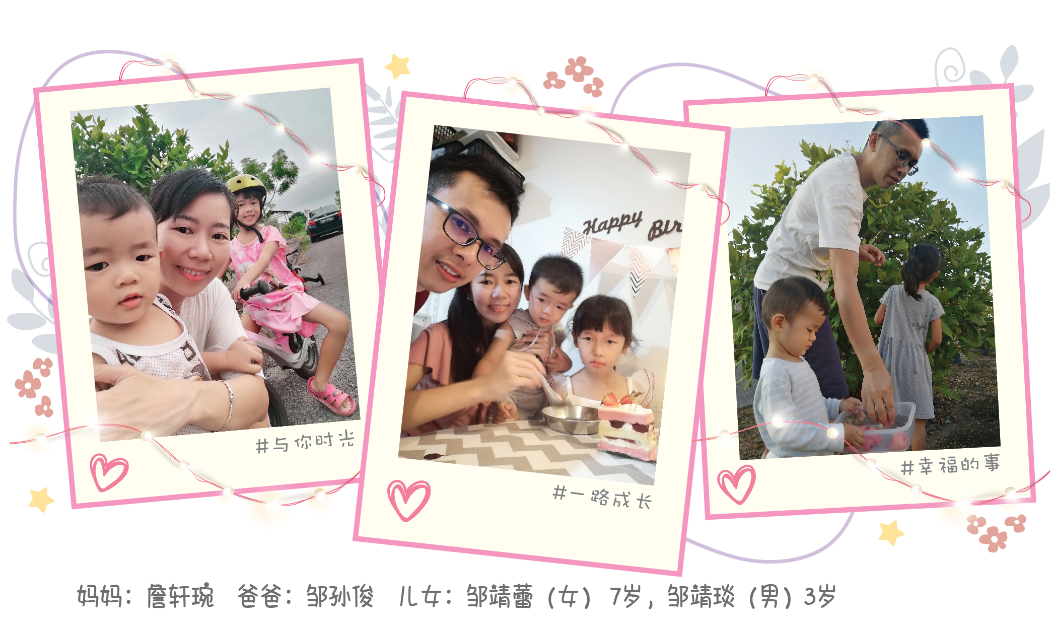 妈妈:詹轩琬 爸爸:邹孙俊 儿女:邹靖蕾(女) 7岁、邹靖琰(男)3岁