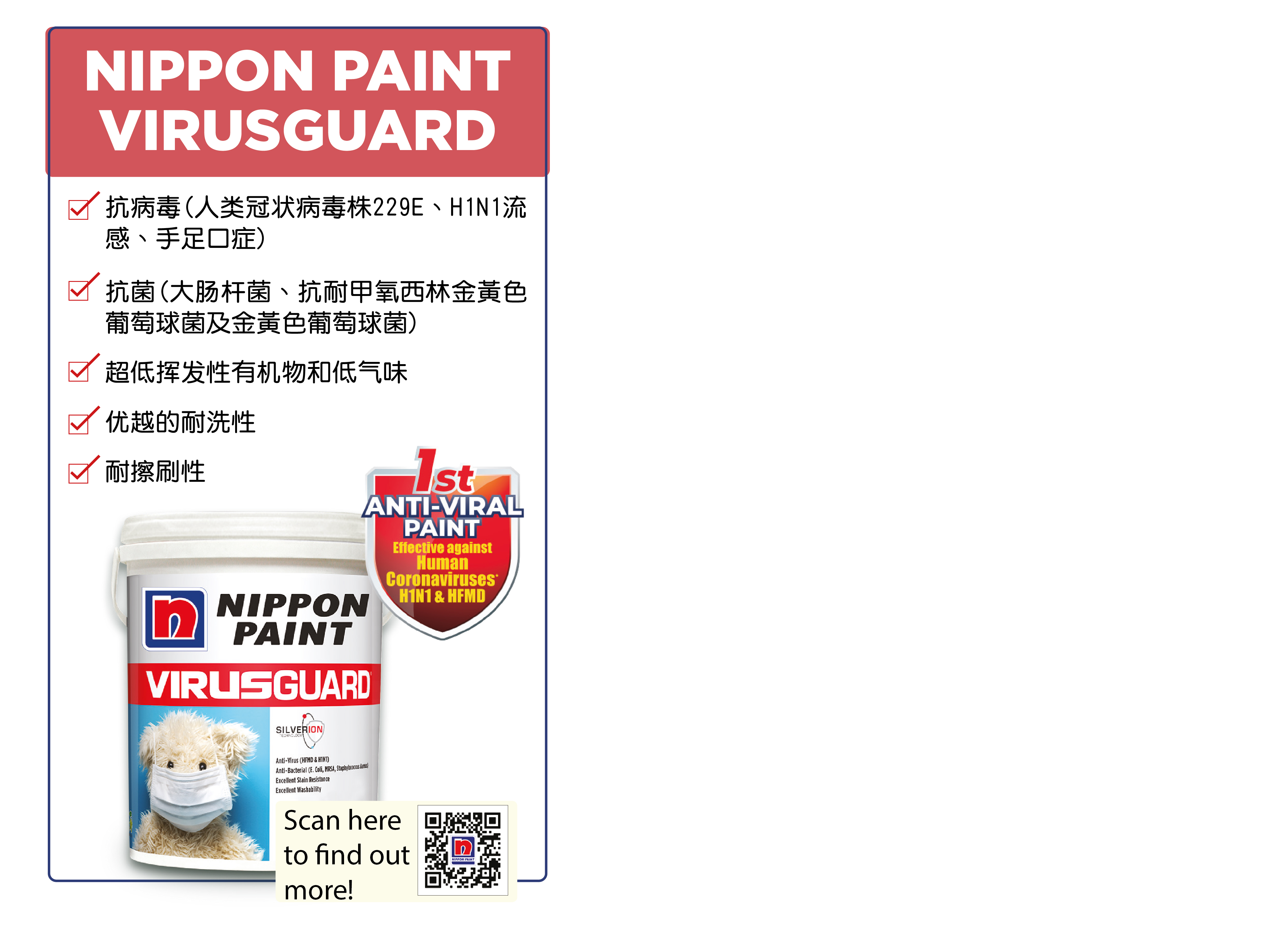 Nippon Paint VirusGuard 是一种具有抗病毒和抗菌功效的涂料。此款涂料已在实验室内进行了测试,证明对抵抗人类冠状病毒(229E株)的有效率为99%。