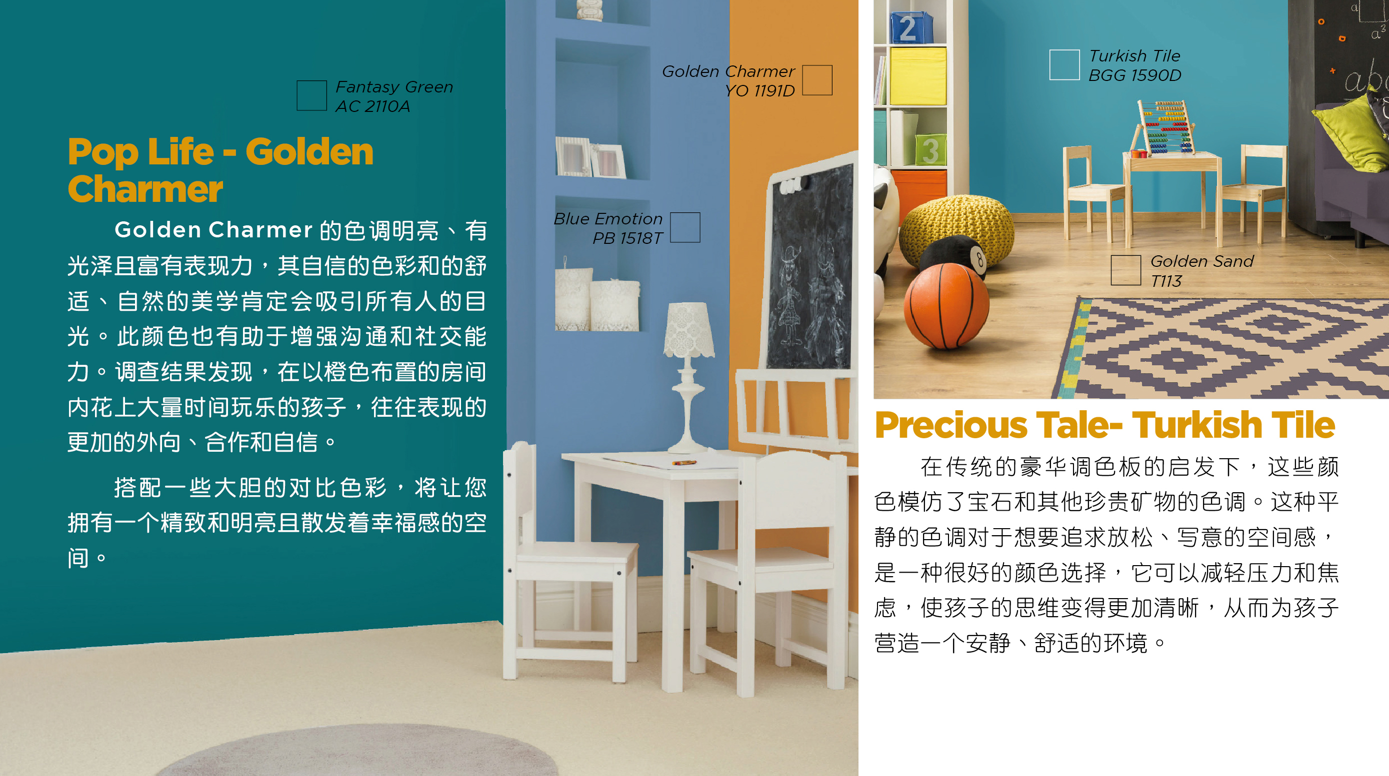 这两种颜色可以激发您孩子的创造力-Golden Charmer和土耳其瓷砖蓝Turkish Tile。此两种颜色是您孩子的游戏室或书房的绝佳颜色配搭。