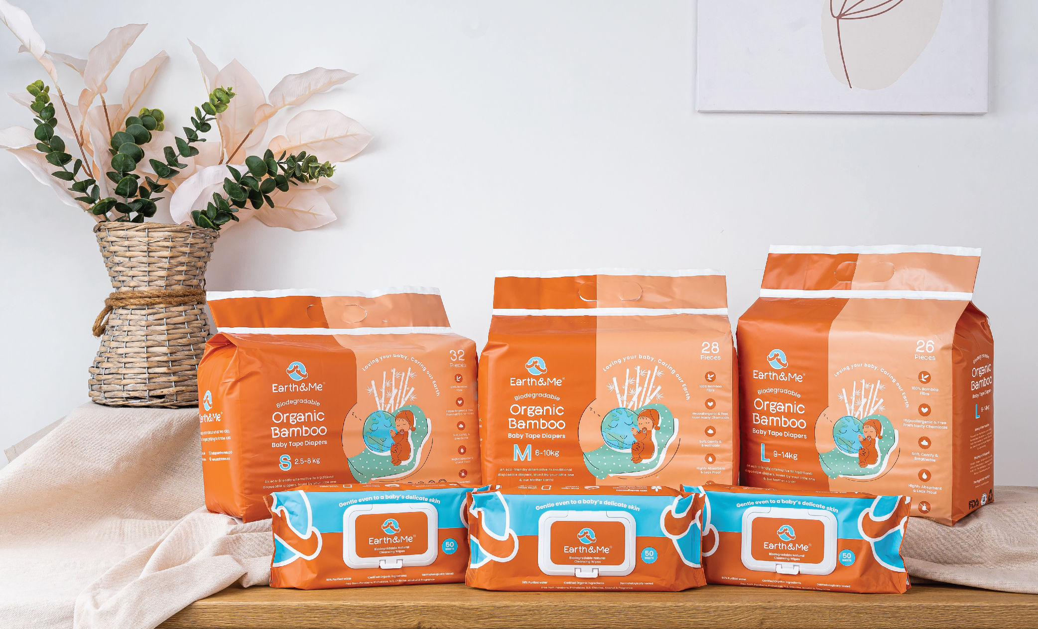 除了其标志性的婴儿纸尿裤外,Earth & Me 也推出了适合婴儿使用的天然擦拭湿纸巾。其湿巾采用无氯木浆所制成,在自然环境下可在 45 天内 100% 被生物降解。其湿纸巾采用 99% 的纯净水和经认证的有机植物如芦荟叶、积雪草和葡萄柚的植物精华萃取所组成,不含人工香料、化学物质和酒精。此湿擦拭纸巾的厚度远比市场上的湿巾更厚、更宽,且具有蜂窝状纹理,更容易、有效的进行清洁的工作。