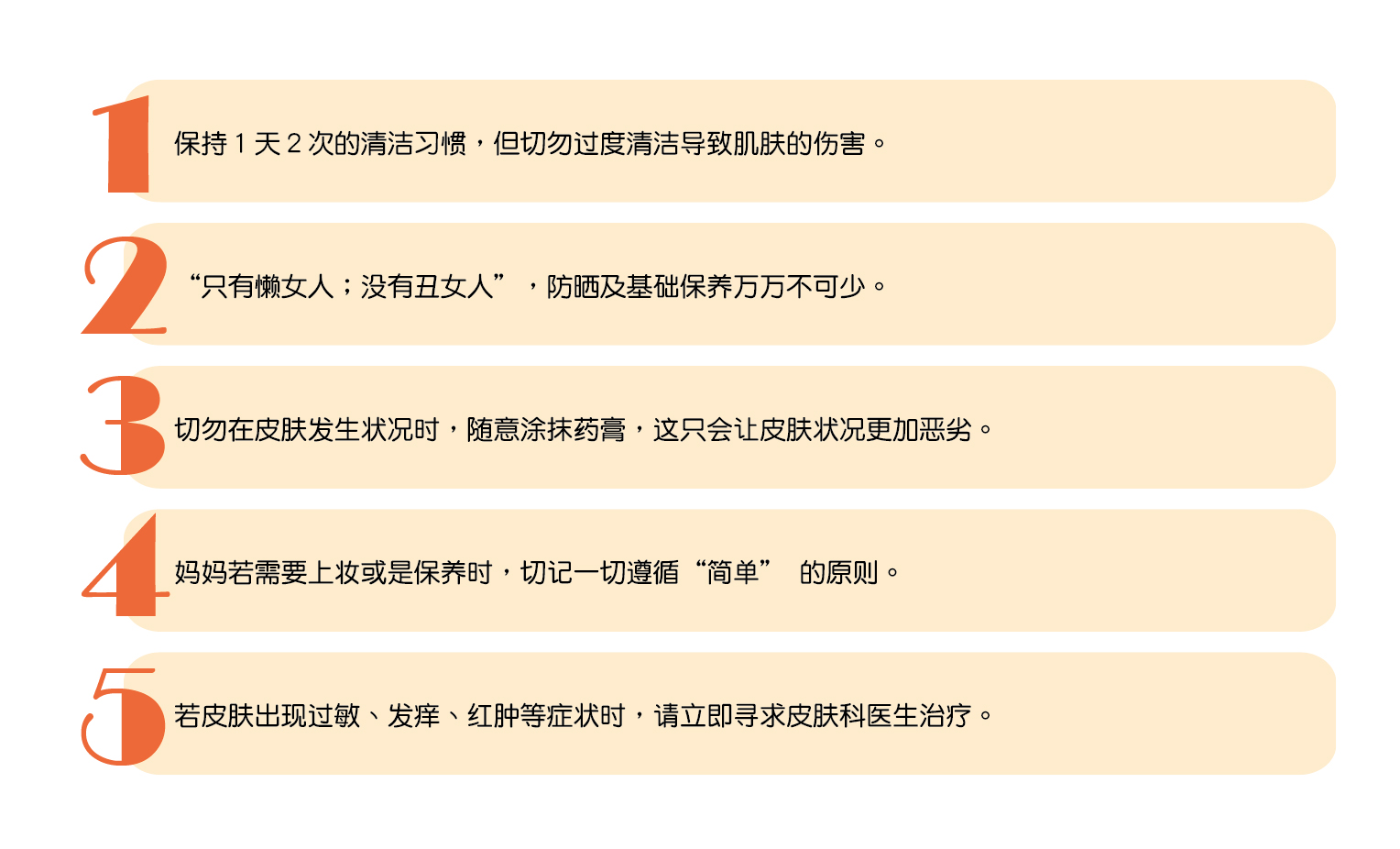许多妈妈会问,平时到底该如何对待皮肤才是最好的呢?皮肤科医生提供以下5点建议: